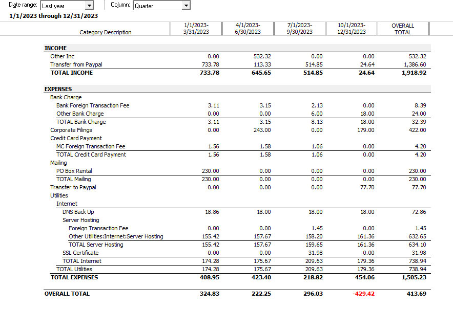 We started 2023 with US$18,321.37 in the bank, and our end-of-year balance was $18,735.06