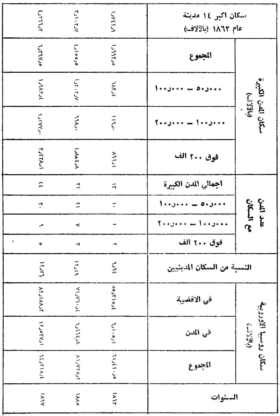 توفر روسيا ما بعد الاصلاح المثال على تزامن هاتين العمليتين. ففي مطلع الإصلاح، في الستينيات من هذا القرن، كانت الاطراف الجنوبية والشرقية من روسيا الاوروبية قليلة السكان، وكان المهاجرون من مناطق روسيا الوسطى والزراعية يتوافدون اليها بأعداد ضخمة. والواقع ان هذا التكوّن لسكان زراعيين جدد على مساحات أرض جديدة هو الذي تولى التعتيم على العملية الموازية، عملية تحول السكان من الزراعة إلى الصناعة. ولتوضيح الصورة عن هذه السمة المميزة لروسيا، بناء على المعطيات الاحصائية عن سكان المدن، يجب تقسيم المقاطعات الخمسين لروسيا الاوروبية إلى مجموعات مستقلة. فنقدم المعطيات عن السكان المدينيين في تسع مناطق من روسيا الاوروبية للعام 1863 والعام 1897 [2] .