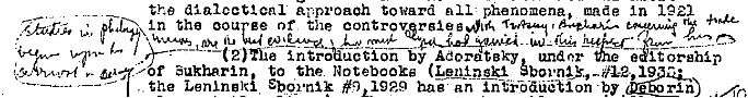 (2) The introduction by Adoratsky,4 under the editorship of Bukharin,5 to the Notebooks (Leninski Sbornik,6 #12, 1933; the Leninski Sbornik #9, 129 has an introduction by Deborin7 along similar lines). These state the following (a) "In all works after 1914 Lenin mentions the dialectic. For example: 'Collapse of the 2nd Int.', 'Results of the Discussion on Self-Determination', 'About the Junius Pamphlet' and the Trade Union dispute". (b) then cites the notes of the Lenin institute which show that on 11/30/20 Lenin asked for a copy of S. Labriola: His. Mat. & About Philosophy; Ilyin: Hegel. Also in that year he asked for a Russian edition of Hegel's Science of Logic. (c) letter to editors of Under Banner of Marxism in 1923.8 (The introduction by Deborin had also included reference to Lenin's Notes on Bukharin's "Economics of the Transition Period" as being entirely about "method".9 I remember, incidentally that when I studied these notes, although I studied them only as an "economist" I had been much attracted by his criticism of Bukharin's statement as to capitalism being "an antagonistic, contradictory order" because these two words were "not one and the same. The first (antagonism) would disappear, the second will remain under socialism". And began to ply you with questions as to difference of the two in Hegelian terminology. Also, never being able to get away from the accumulation debate, I remember now that the outline of Lenin's intended book against Luxemburg10 included a section entitled "Dialectics and eclectics").11