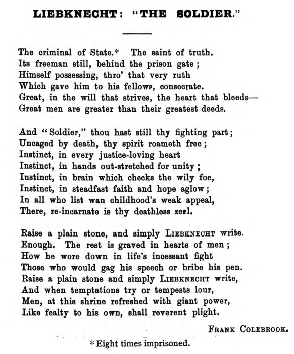 Written: In English by Frank Colebrook, in memoriam of Wilhelm Liebknecht’s death.