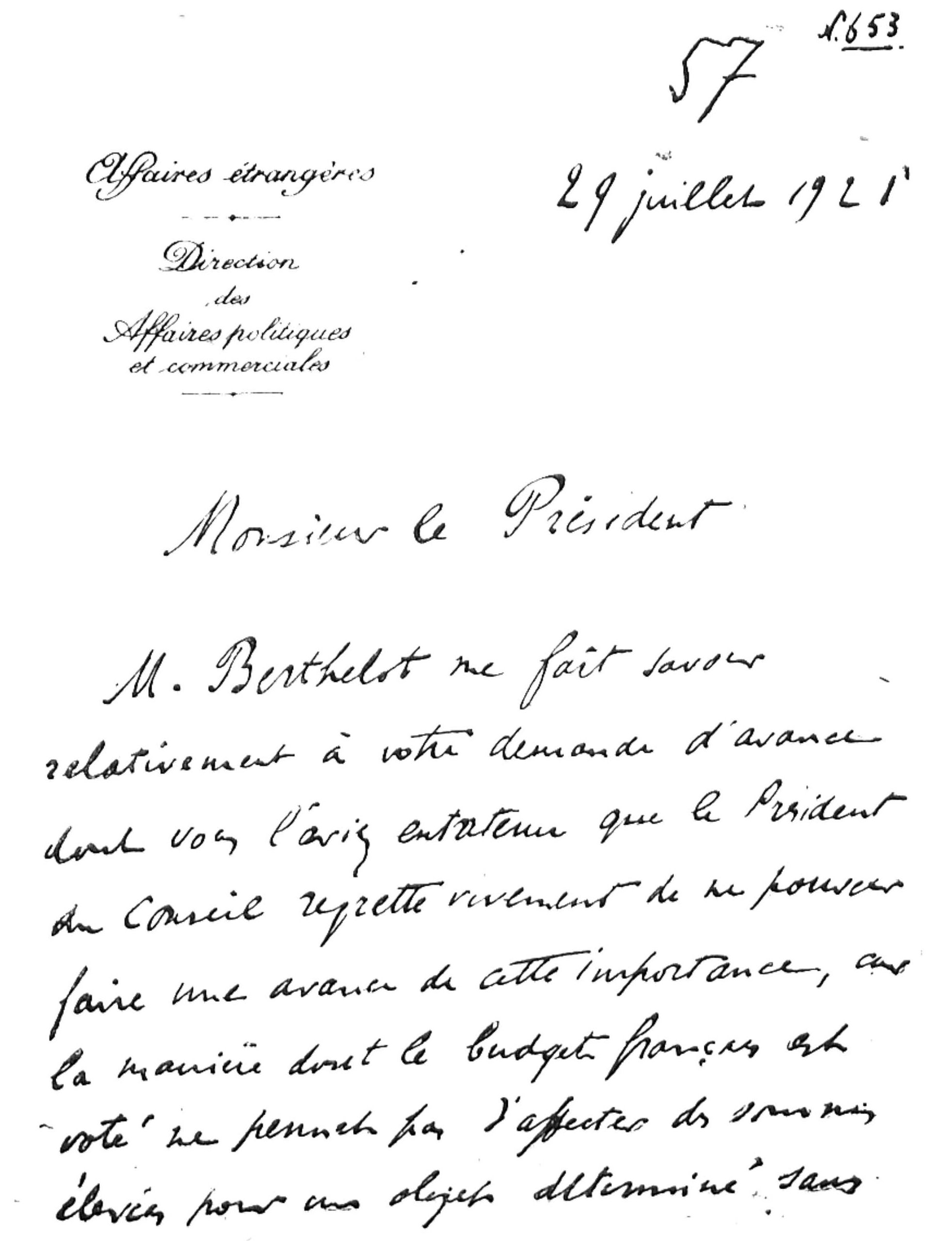 In reference to your request for a money advance, I am informed by Mr. Berthelot, with whom you have already discussed this matter, that the President of the Council deeply regrets not to be able to advance such a large sum, for the manner in which the French budget is voted does not permit a large sum to be expended for a definite item, without the previous sanction of Parliament. Moreover, I believe that the General Secretary will answer you directly on the various questions which you have addressed to him.