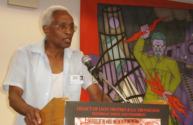 照片:2008年夸梅·桑布鲁在列昂·托洛茨基遗产问题会议(Conference on the Legacy of Leon Trotsky)上发言。背景中的壁画由迈克·阿列维茨(Mike Alewitz)创作。
