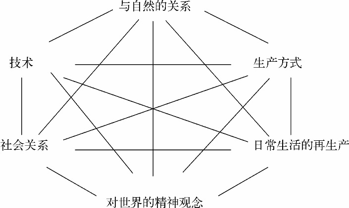 这一框架有助于通过一个基本的方法,将历史唯物主义作为基础,而且正如我所希望展现的,还存在一个强大的证据,为马克思理解资本主义演化过程所采用的大部分无形方法提供了基础。让我在此将这一问题展开论述。我们可以设想这样一个思想架构,在其中这六个要素在一个单一的空间里被悬挂在一起,但它们之间存在很强的相关性(见下图)。每一个要素内部都具有动力,这样,我们认为,每一个要素都在人类演化过程中组成了一个“时刻”。我们可以从时刻的角度来研究演化,或者检验它们之间的互动关系,例如,在技术和组织形式中的变化与社会关系和精神观念之间的关系。我们的精神观念是如何被与我们相关的技术变量所改变的?一旦我们拥有了显微镜、望远镜和卫星,X射线和CAT扫描,我们是否还会以相同的视角观察世界?因为我们所拥有的技术,所以我们目前对世界的理解和思考是以一种彻底不同的方式进行的。但是通过同样的标志,某些人在某些地方必然会产生这样的精神观念,即制造一个望远镜是一件有趣的可以做的事情(提醒大家,马克思着手对劳动过程问题和最糟糕的建筑师的研究)。而且当那个人有这个想法时,他必须能够找到镜头打磨机和镜片制造者,以及其他必需的要素,这样可以通过望远镜的生产将想法变成现实。技术和组织形式不会从天上掉下来。它们由精神观念创造出来。它们也来自我们的社会关系,并且作为对日常生活或劳动过程的实际需要的反应,具体地产生出来。