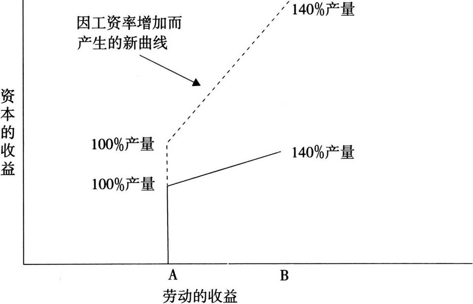 在这两个图中,A 对应的是产量等于或小于 100%的“基本收入”。A 到 B 这一部分是 140%的产量得到的奖金。“业绩”根据产量衡量。标准产量是 100%。工人产量超出 100%开始挣激励性奖金。(“预期的”产量比例是 125%。参见第四章。)
