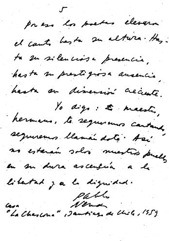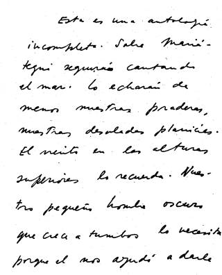 Esta es una antología incompleta. Sobre Mariátegui seguirá cantando el mar. Lo echarán de menos nuestras praderas; nuestras desoladas planicies. El viento en las alturas superiores lo recuerda. Nuestro pequeño hombre oscuro que crece a tumbos lo necesita porque él nos ayudó a darle nacimiento. El comenzó por darnos luz y conciencia. Los poetas seguirán cantando su partida, sus obras, su cristalina contribución. Aquí sólo hay algunas hoces que levantan cantando el cereal que nos legara. Aquí silo hay algunas notas de quena, de lira, de guitarra, que lo llaman aún. El desde su ausencia acude, acude siempre. Porque está vivo. Resplandece detrás de las antiguas piedras peruanas, camina por vías y carreteras, sube por los andamios, continúa su pensamiento. En el juego de la vida y la muerte Mariátegui sacó —no por azar— la cara o la cruz de la vida. Otros, vociferantes, inauditos, son vividores pero no vivientes. El, de sus propias, dolorosas células construyó tanto que lo que hacemos y haremos tiene en él sus cimientos. Fue un examinador que enseñaba, fue un maestro que metió las manos en la tarea y en el hombre para amalgamarlos y encaminarlos en la Historia. Por eso los poetas elevaron el, canto hasta su altura. Hasta su silenciosa presencia, hasta su prestigiosa ausencia, hasta su dimensión creciente. Yo digo: maestro, hermano, te seguiremos cantando, seguiremos llamándote. Así no estarán solos nuestros pueblos en su dura ascensión a la libertad y a la dignidad. PABLO NERUDA.