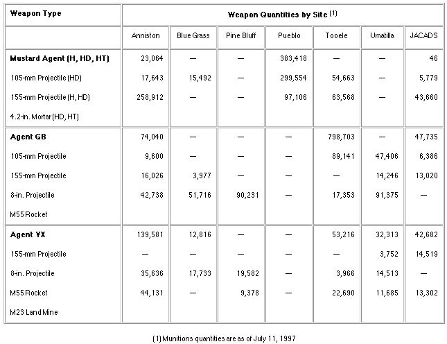 Blue Grass, KY: 523.41 tons. "The stockpile consists of projectiles and rockets containing nerve agents GB (Sarin) and VX, and mustard or blister agent."