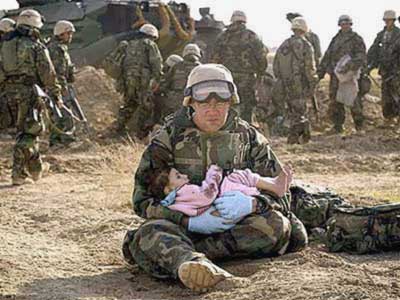 A doctor with the U.S. Marines cradles a child in central Iraq whose mother had been killed.
