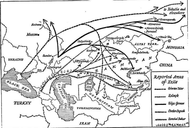 Нациите присилно преселени во 1941-47 година беа протерани во источните региони на СССР, како што е прикажано на картата долу:
