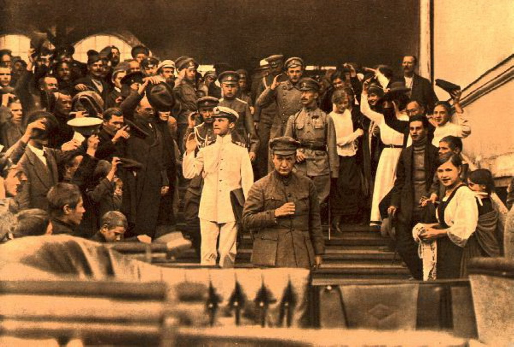 Imagem: Em frente ao edifício do teatro Bolshoi. A chegada de Kerensky para participar da reunião. Clique na imagem para ampliar.