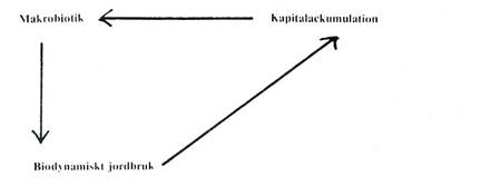 Makrobiotikens oförenlighet med kapitalismens organisationsform har sin grund i att makrobiotikens värden är absoluta (bruksvärden), medan kapitalismens värden nödvändigtvis är relativa, nämligen bytesvärden. Abstraktionen kapital är för makrobiotiken fullständigt ovidkommande. I sin praktik var mikro-makrofolket klart anti-förbrukare och därmed dåliga tjänare åt kapitalackumulationen. Gruppen var dock för liten för att direkt undertryckande skulle bli nödvändigt. (Man skall emellertid inte vara blind för att kapitalet efterhand har lyckats inrätta en särskilt ”hälsomarknad” åt dem). Därtill kom diverse försök att upprätta produktionskollektiv, och därmed förneka den privata äganderättens princip. Den mest betydelsefulla konflikten med det organisationsmässiga planet uppkom dock antagligen på omvägar. Biodynamikens teknologiska underlägsenhet yttrar sig nämligen däri, att marknadsmekanismen blir ett hinder. Man har istället försökt upprätta andra fördelningssystem, där varorna avsättes mot betalning till andra kollektiv i kraft av ideologisk gemenskap. Här är det alltså tal om en motverkande återmatningsslinga. (se fig. 4)