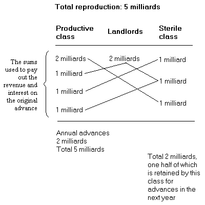 Giai cấp sản xuất, sau khi thay thế số tư bản lưu động của mình bằng hiện vật, vẫn còn có một tổng sản phẩm nông nghiệp trị giá 3 tỷ và hai tỷ tiền mặt. Giai cấp địa chủ chỉ có mặt trong đó trước hết với cái quyền được nhận một số tô là hai tỷ mà giai cấp sản xuất phải trả. Giai cấp không sản xuất có hai tỷ hàng công nghiệp. Một lưu thông chỉ diễn ra giữa hai giai cấp trong số ba giai cấp đó, được các nhà trọng nông gọi là một lưu thông không đầy đủ, một lưu thông diễn ra giữa cả ba giai cấp được gọi là một sự lưu thông đầy đủ .